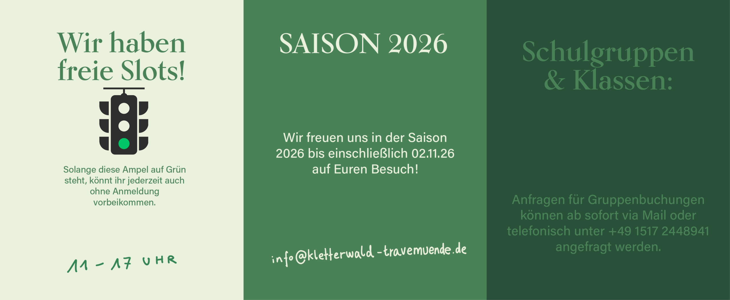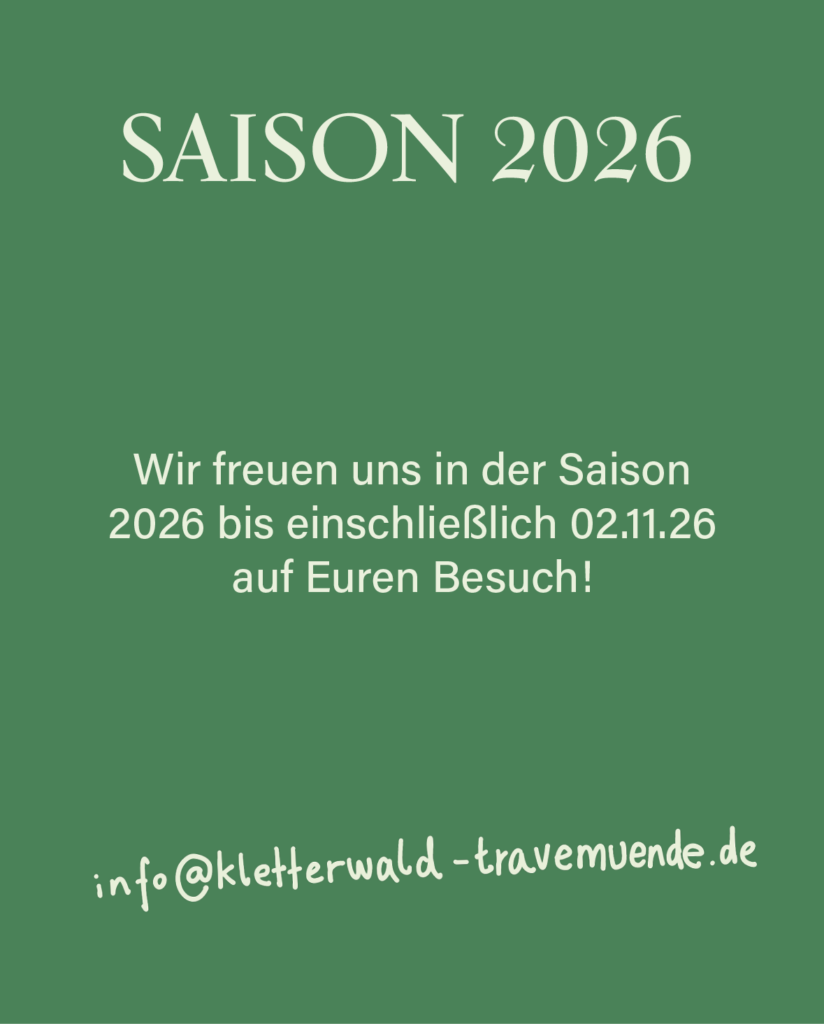 +++ Anfragen zu Gutscheinen/Saisonticktes und Buchungen für das Jahr 2026 gerne per Mail an info@kletterwald-travemuende.de